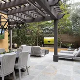 dining and bar entertainment area. Large trellis offering shade on both sides of the yard with
