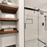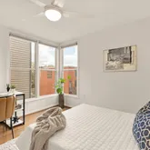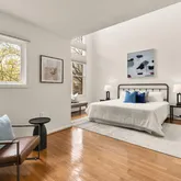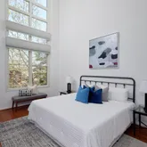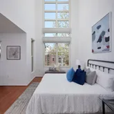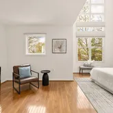 Upstairs, the primary suite is one for the magazines, featuring cathedral ceilings and 22-foot windows that flood the space with natural light. Newly installed motorized blinds offer shade and privacy with the touch of a button, and storage is abundant across three generously sized closets with custom built Elfa storage. The recently renovated en-suite bathroom is your private retreat with a dual vanity, built-in linen storage, and a spacious walk-in shower with dual showerheads. Two additional bedrooms, a full bath, and a dedicated laundry area round out the upper level.