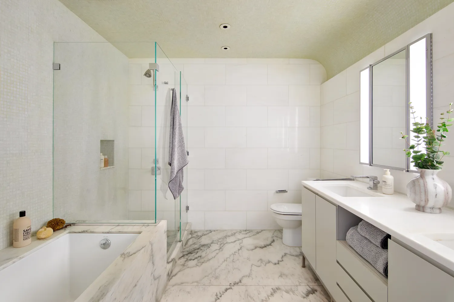 The primary bedroom boasts a generous walk-in closet, a secondary closet, and a custom-designed en-suite bathroom featuring marble slab floors, a separate tub and standing shower, and double sinks with oversized storage vanities by Shamir Shah Designs. The versatile guest bedroom, which can also function as a home office, offers an en-suite bath and sliding doors that connect to the living room, enhancing flexibility.