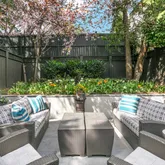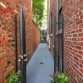 Entry into the combined living and dining space provides a warm and spacious welcome. The main level also includes a chef's kitchen with marble countertops and island and new stainless steel appliances. The adjacent family space accesses the rear of the property via French doors. Pantry storage and a powder room complete the main level. Outdoors, the private terrace provides generous dining and relaxation space, a gas line hookup, mature landscaping and street access via private, gated alley.