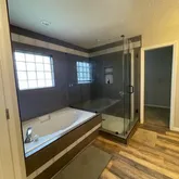 en suite- dual sink vanity, soaking tub, updated shower, and large walk...Tenant Occupied until 3/31. Pictures were taken prior to current tenant in place. Lovely home on corner lot. Beautiful wood floors throughout main level and on stairs! Carpeted in bedrooms. Flex Space/ Office with doors is off entry. Formal dining