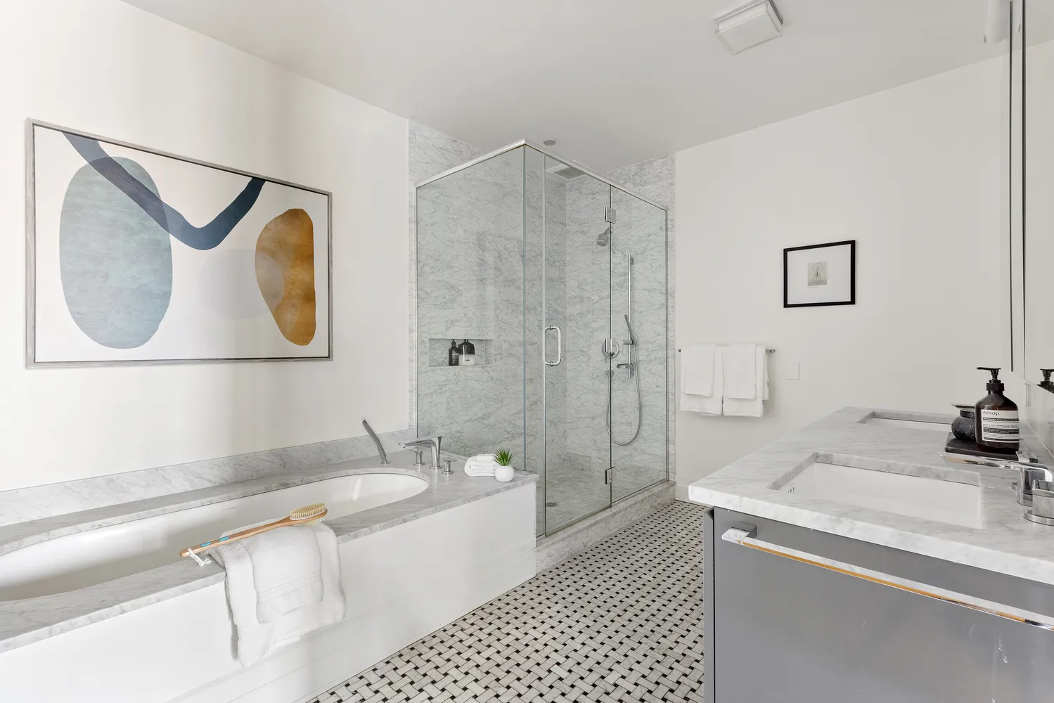 This unique floor plan separates the second and third bedrooms from the primary bedroom with a luxurious marble bath. The suite is complete with a fully built out walk-in closet and an enormous bathroom with a deep soaking tub, a separate enclosed shower, double vanities of Carrera marble and Waterworks fixtures.