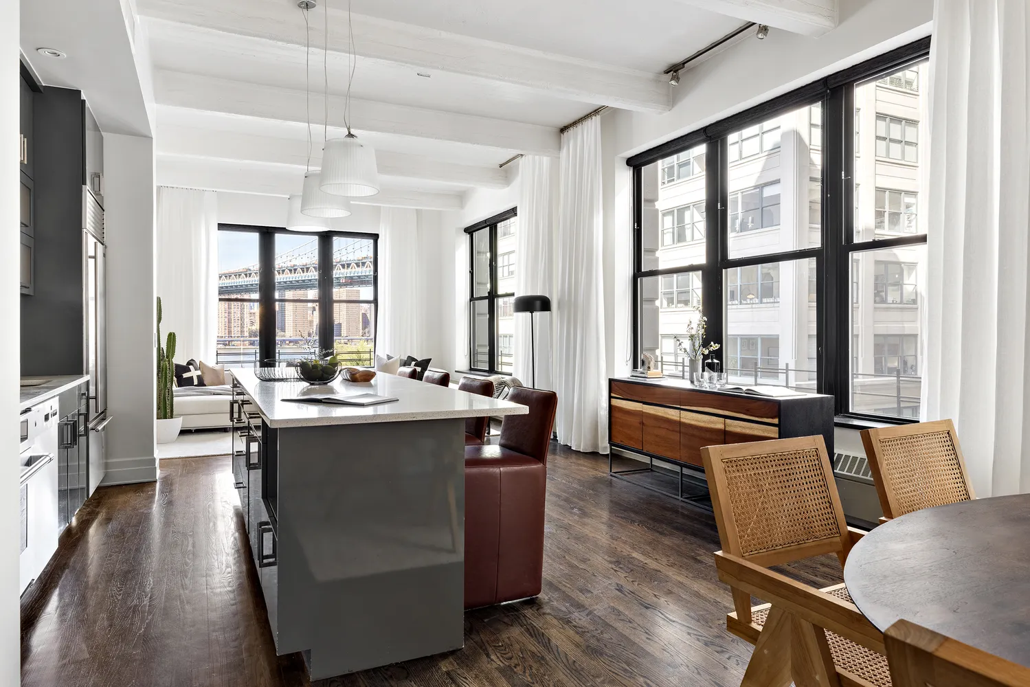 A well-appointed entry gallery opens onto an enormous great room with 11 foot-high concrete beamed ceilings and matte finished oak hardwood flooring. This corner unit is fully surrounded by oversized windows...Rarely available B line in the Sweeney Building. This exceptional 3 bedroom loft will captivate you with soaring ceilings and chic design. Ideally proportioned, striking the perfect balance of home and industrial, this home features beautiful views of Brooklyn Bridge Park and the East River.