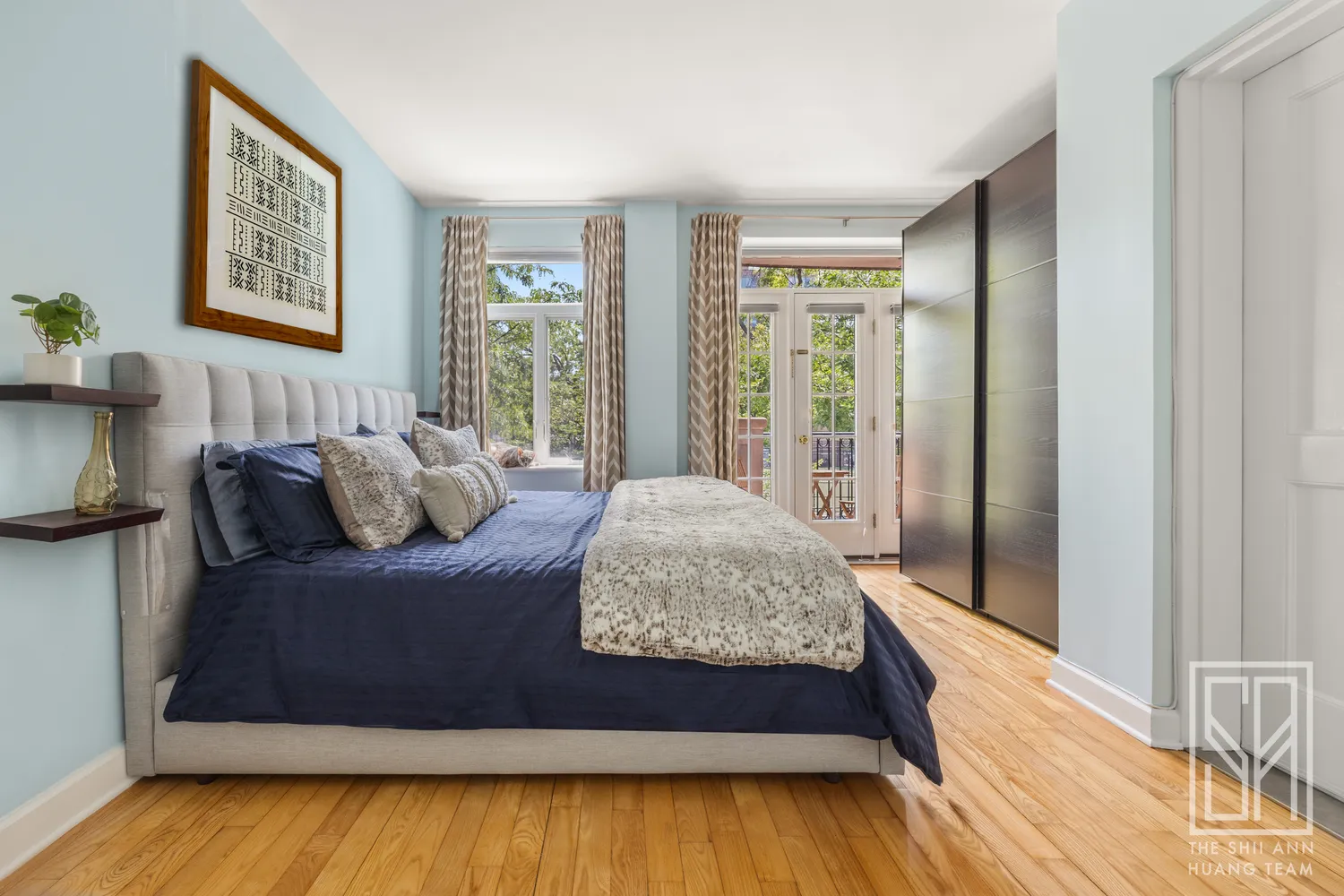 Down the hall, the king-sized primary with custom walk-in closet, en suite bathroom, and second private south-facing balcony overlooking Washington Park. Two additional, well-proportioned bedrooms and a second full bathroom complete the picture. A spacious foyer with a large coat closet, in unit washer/dryer, hardwood flooring throughout, and central A/C add to the luxurious feeling of this well managed condo.