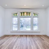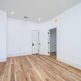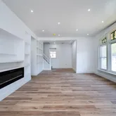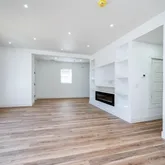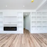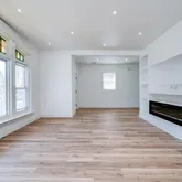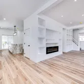 Step into a bright and airy first floor featuring an open-concept layout, high ceilings, crisp white walls, and brand-new flooring throughout. The spacious living area offers a cozy electric fireplace, custom built-ins with recessed lighting, and plenty of room to relax or entertain.