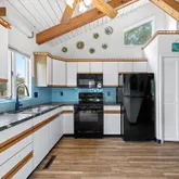 Walk inside this home and you immediately notice the beautifully updated wood flooring, wood burning fireplace and beautiful wood ceilings throughout the home, all adding a touch of elegance to the interior. An updated kitchen, featuring new appliances complimented with sleek countertops and large windows provides a beautiful setting to work on your culinary delights. The large bathrooms have also been renovated, boasting modern fixtures with a fresh new look.