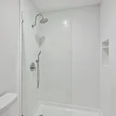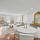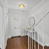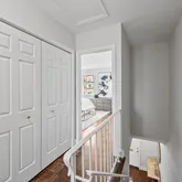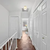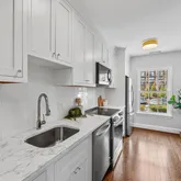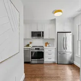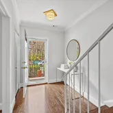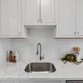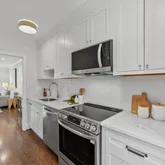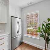 The entry level unveils a fully reimagined kitchen, a true centerpiece of the home. Equipped with all new stainless steel appliances, the kitchen offers ample space for a breakfast table or additional storage. Custom inset cabinetry, sleek nickel fixtures, solid-surface white marble quartz countertops, and a calming neutral palette elevate this space into a designer’s dream.