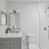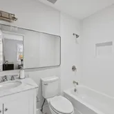 Ascend to the upper level, where two generously proportioned bedrooms, each with en-suite baths, await. The primary suite boasts expansive closets and a meticulously renovated bathroom featuring a striking floating vanity with marble counter, hexagonal marble flooring, brushed nickel finishes, and modern lighting. The spa-inspired walk-in shower is adorned with custom large format tile and a shampoo niche. The second bedroom offers its own remodeled bath with a new designer vanity with marble counter top, premium tile, a custom mirror and marble flooring and polished nickel finishes. This level also includes a linen closet, a spacious laundry closet with a full-sized washer and dryer, and a utility closet for added convenience.