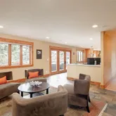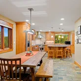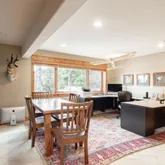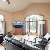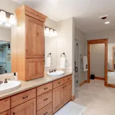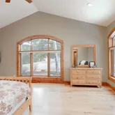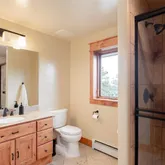 - Room Description: In-floor radiant heat,Extra large shower, double wide glass shower doors to allow for wheelchair access, double head, steam, no tub, very spacious, private commode, heated towel rack, solid granite, knotty alder cabinetry