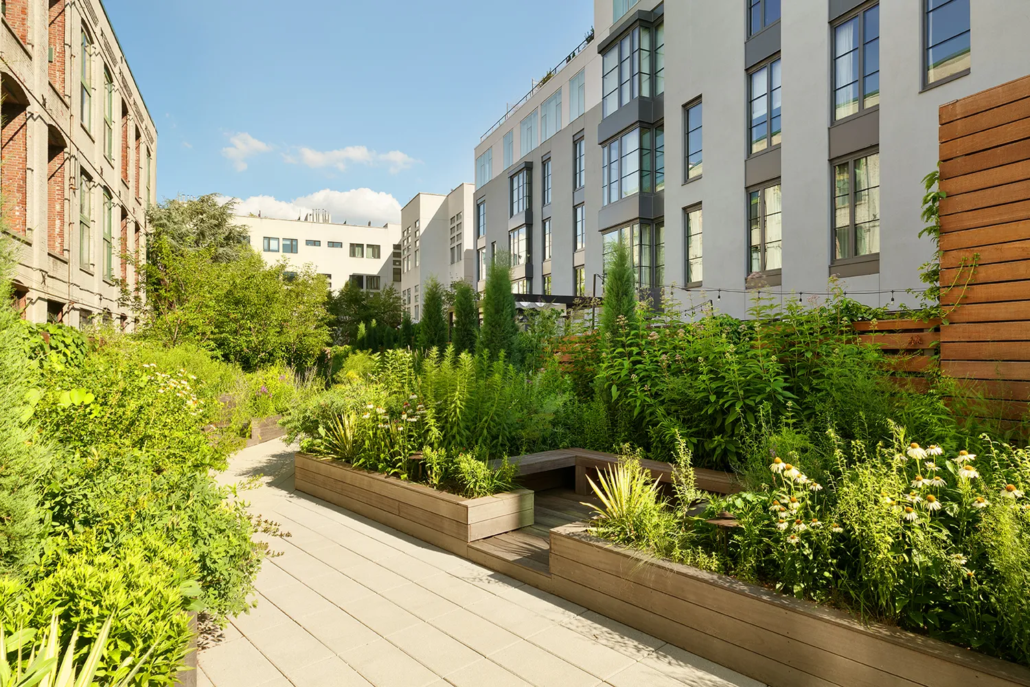 Incomparable Manhattan-style service and amenities for a building this size include a state-of-the-art fitness center (with kettle bells, cable systems, multiple Pelotons and more), a toy stocked and adorable children’s playroom, a brilliant common rooftop with 360 degree unimpeded urban views and gas BBQ grill, and the VERY BEST backyard garden in all of New York City: a 5300sf landscaped wonder in the natural botanical style of the High Line, with its own bocce court and multiple shady seating nooks.