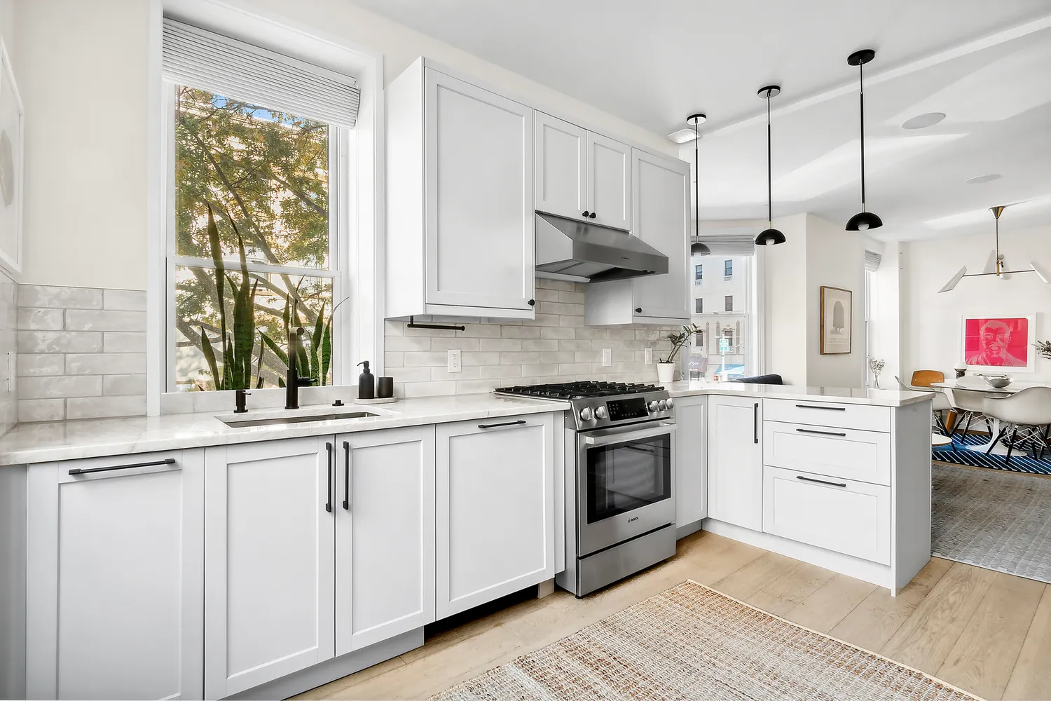 -Elegant bay windows, wide plank oak flooring, and designer light fixtures create a warm and inviting atmosphere.
