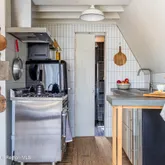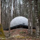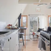 The open floor plan combines comfort with modern design featuring high ceilings, a wood-burning stove, skylights, concrete countertops, and updated appliances. The cabin has two bedrooms and a small loft that provides additional sleeping space for extra guests. Outside, enjoy the expansive deck, raised beds, or the garden dome. After a day of activities, gather around the fire pit to share stories or curl up and watch a movie on the projector.