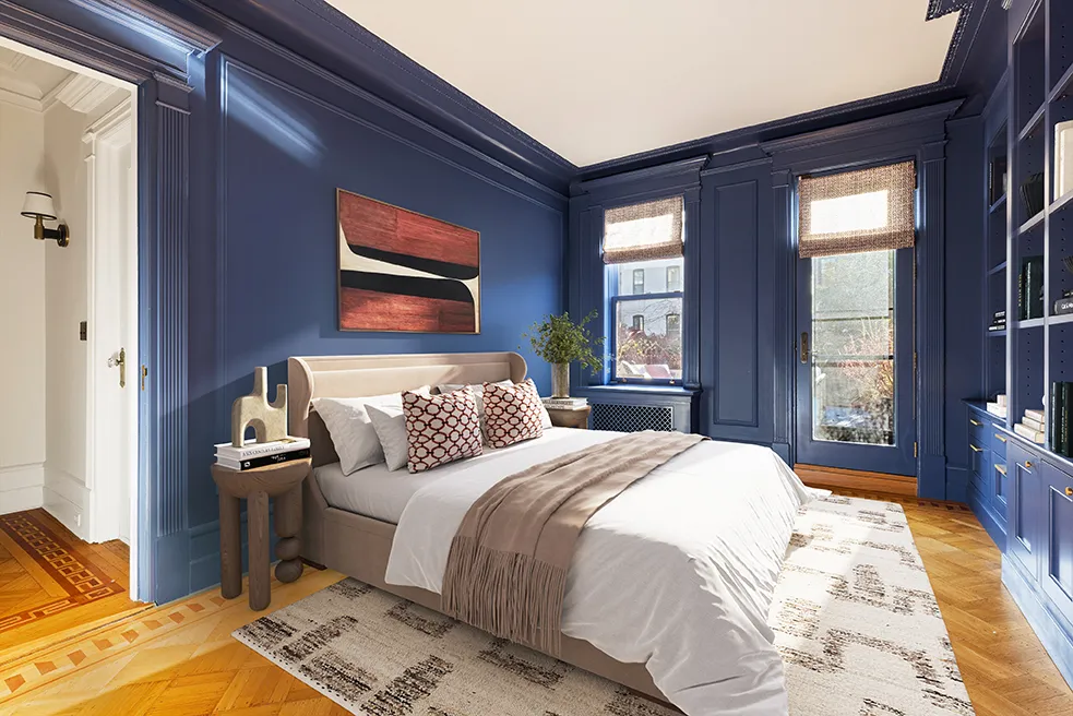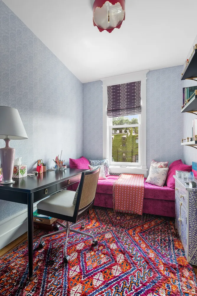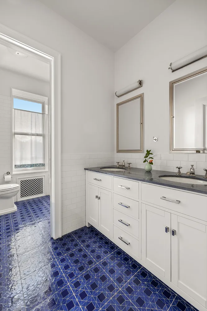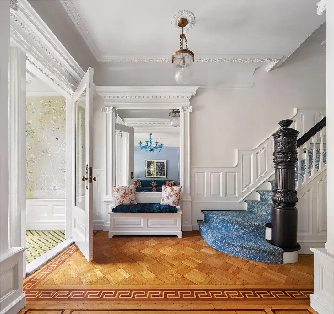 Step into the foyer, adorned with de Gournay wallpaper and zellige tiles, to an impressive entryway with an original pier mirror and dramatic curved staircase, engraved with seashells. The parlor level features four grand spaces, including a living room, a bar/music room, formal dining, and a dream kitchen. Located in the rear, full width extension unusual in Park Slope townhouses, this grand eat-in kitchen streams in south-facing light, hitting the wraparound blue cabinetry, oxblood Viking range, and striking Fior di Pesco marble backsplash. Subtle details, such as aged brass Waterworks hardware and a fireclay sink, in combination with generous, well-designed storage, make this a functional and beautiful retreat for any home chef. Ideal for formal and informal entertaining, the parlor level also features a beautifully outfitted powder room.