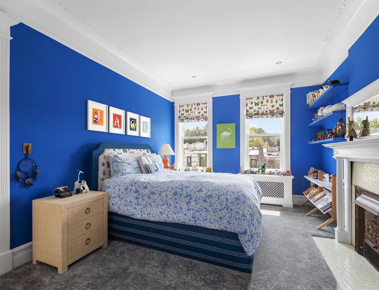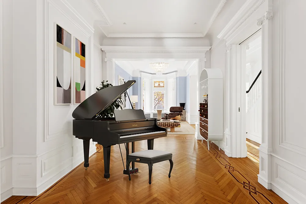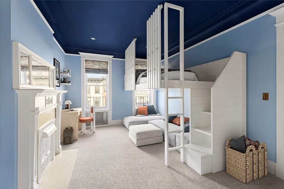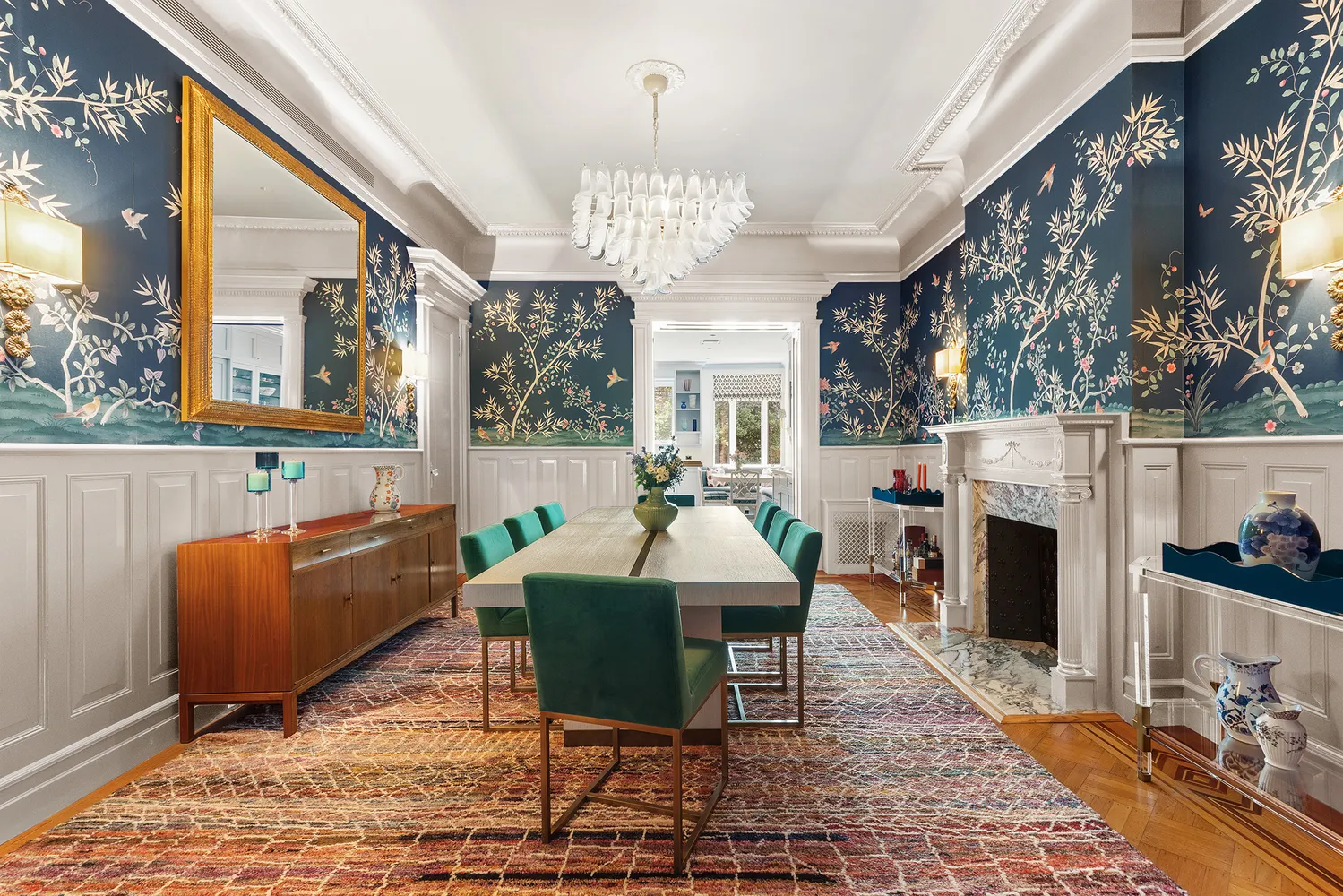 Step into the foyer, adorned with de Gournay wallpaper and zellige tiles, to an impressive entryway with an original pier mirror and dramatic curved staircase, engraved with seashells. The parlor level features four grand spaces, including a living room, a bar/music room, formal dining, and a dream kitchen. Located in the rear, full width extension unusual in Park Slope townhouses, this grand eat-in kitchen streams in south-facing light, hitting the wraparound blue cabinetry, oxblood Viking range, and striking Fior di Pesco marble backsplash. Subtle details, such as aged brass Waterworks hardware and a fireclay sink, in combination with generous, well-designed storage, make this a functional and beautiful retreat for any home chef. Ideal for formal and informal entertaining, the parlor level also features a beautifully outfitted powder room.