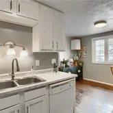 main floor features a cozy eat-in kitchen with sleek white cabinetry, a spacious living area,