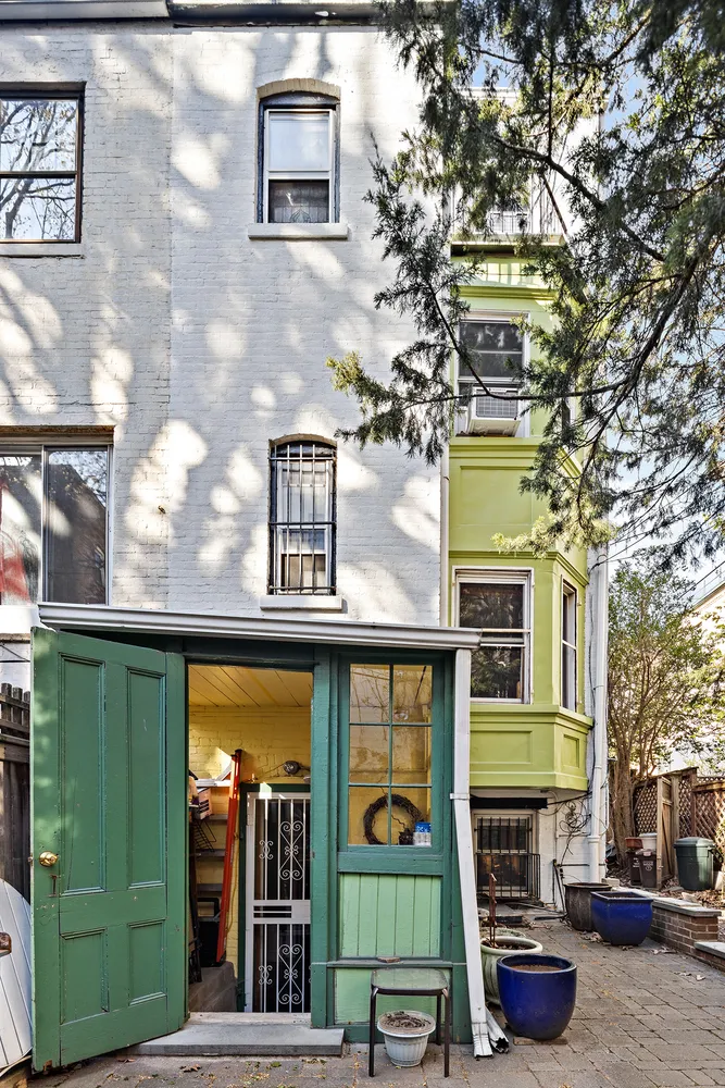 Enter through a private gated entrance into the garden apartment and you will find a large front parlor, windowed hallway bathroom, and large kitchen with beautiful tin ceilings and built-in cabinets. Walking though the kitchen will lead you into a bonus area currently configured as a home office, and then off through your own “mud-room” and out into the huge double wide backyard with mature trees, complete with waterfall.