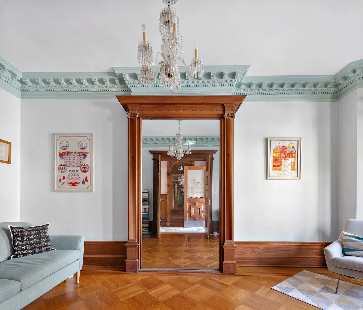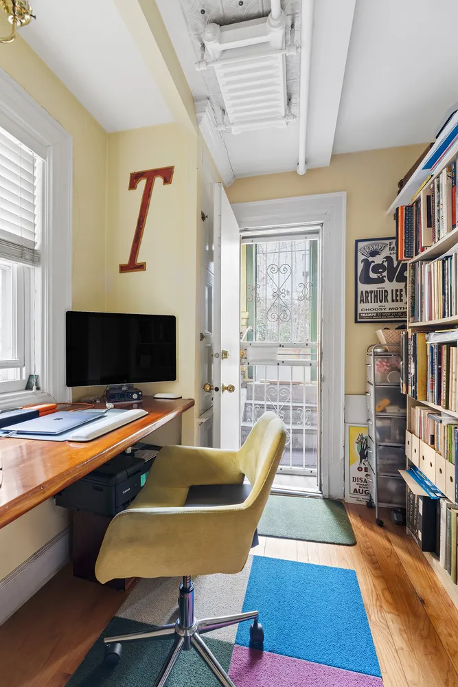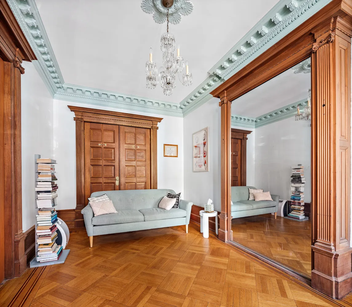 From the stoop, enter the triplex through a foyer and into the receiving gallery with its grand decorative fireplace, one of 6 in the house. This floor delights with a cheerful south facing parlor, and a spacious garden facing living area with pocket doors and half bathroom.