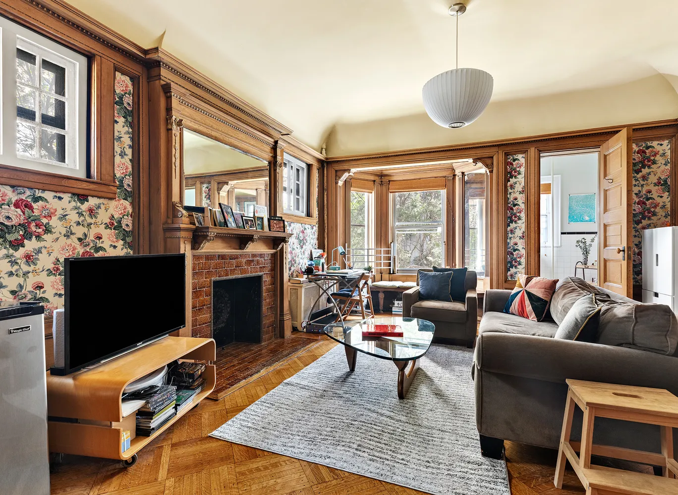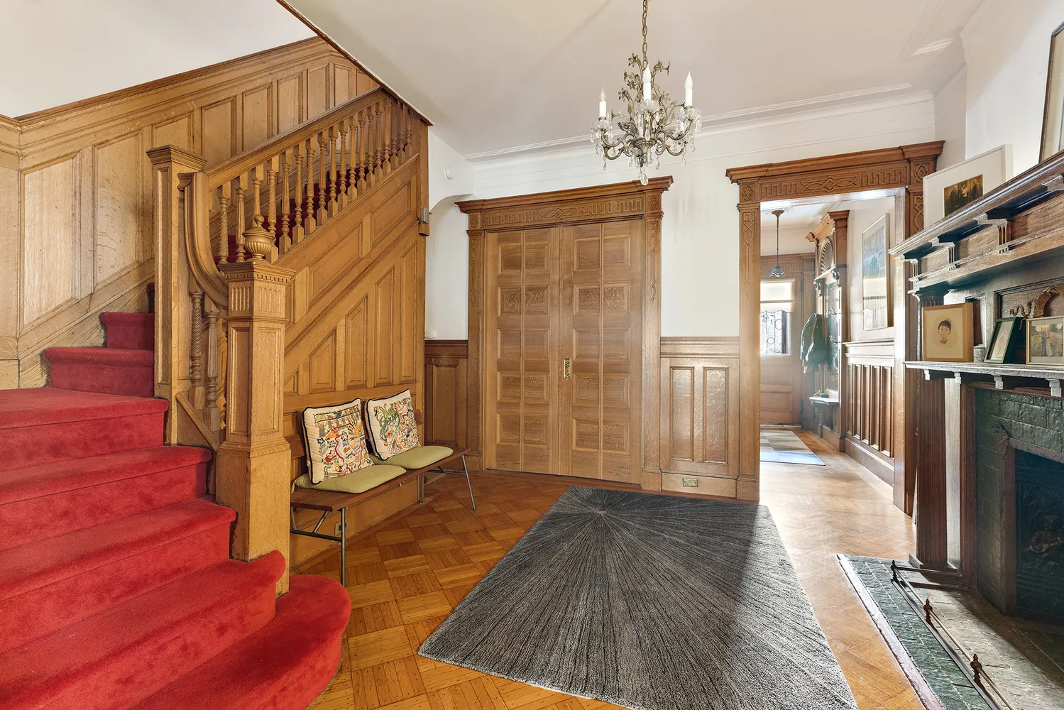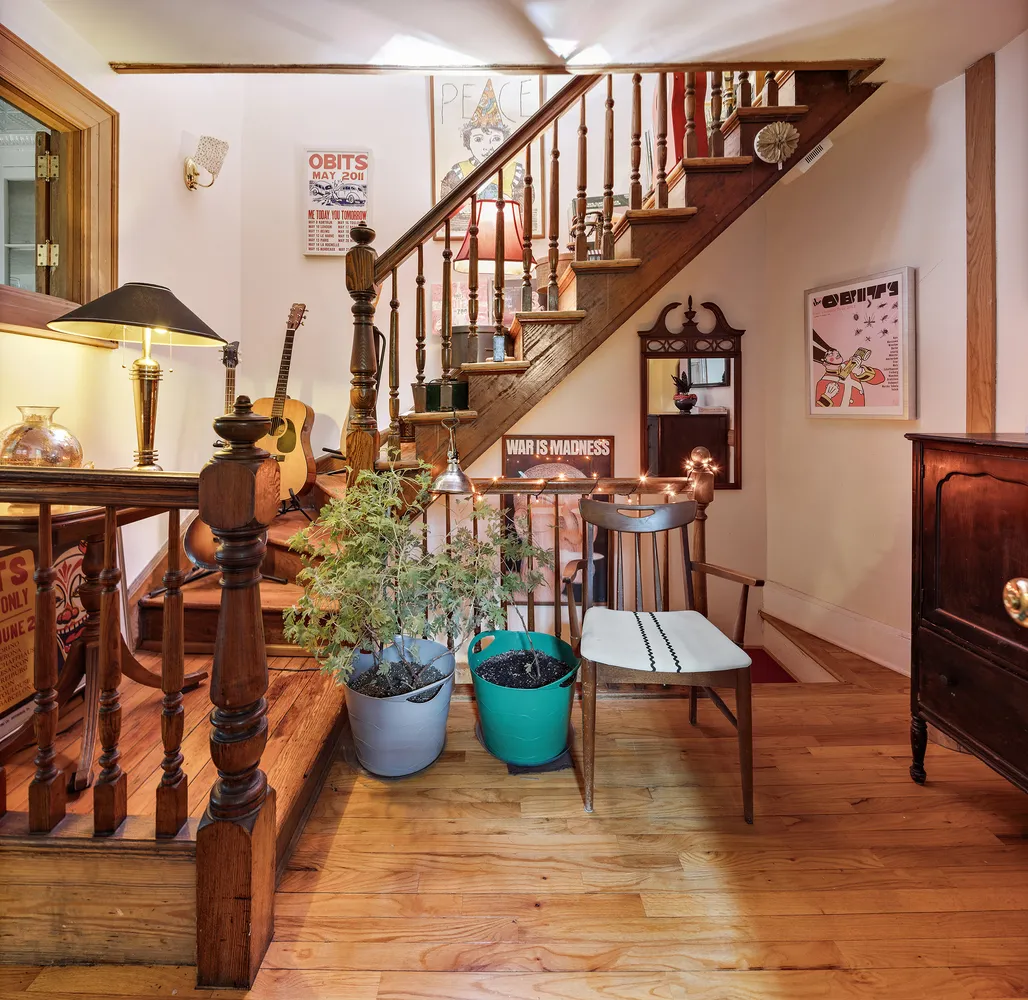 From the stoop, enter the triplex through a foyer and into the receiving gallery with its grand decorative fireplace, one of 6 in the house. This floor delights with a cheerful south facing parlor, and a spacious garden facing living area with pocket doors and half bathroom.
