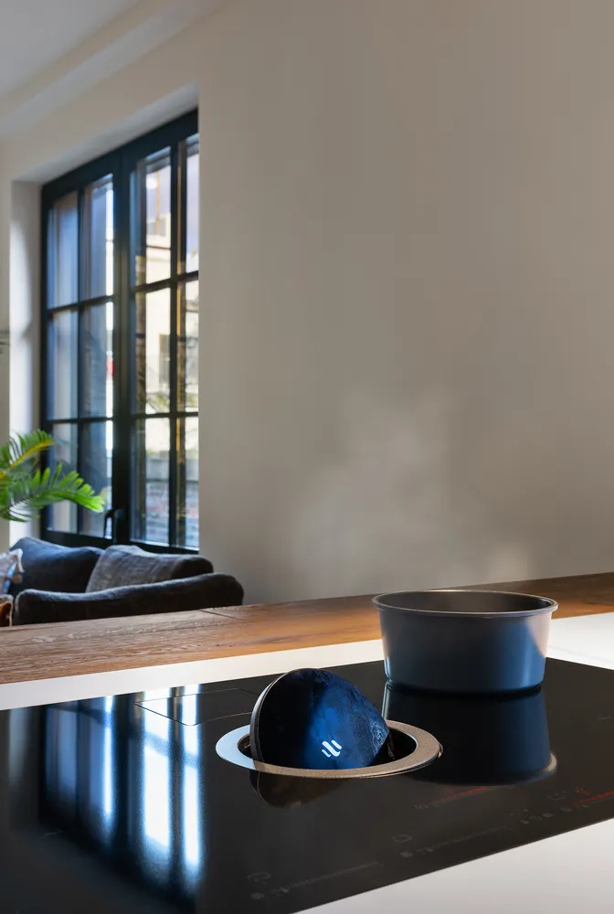 The kitchen is finished in glass and has tons of storage and an Elica NecolaTesla Switch induction stove with the suction heart pulling the exhaust through the center of the oven.