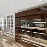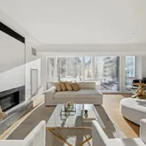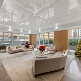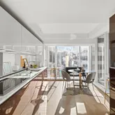 From the elevator landing, one is greeted by a wall of windows and an impressive great room wrapped in glass from all sides allowing light to flood in from the sweeping Eastern and Southern exposures. Located on the eastern side of the great room features a wet bar, built-in gas fireplace and library with Eastern exposure. Off of the dining room is a thoughtfully designed eat-in windowed kitchen with top of the line Miele appliances, and a luxurious array of finishes including Dada Italian Walnut and custom glass cabinetry and Calacatta Vision marble counter tops. The massive terrace wraps around the eat in kitchen, great room, and library.