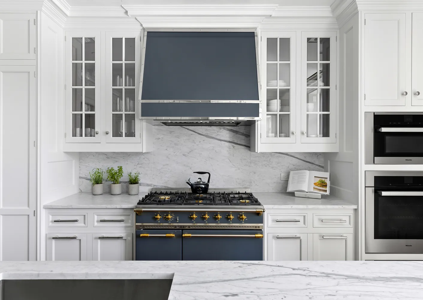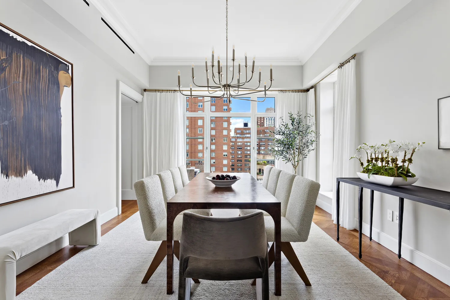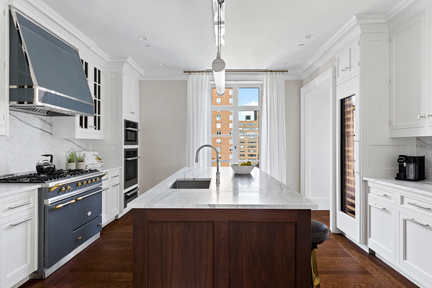 The heart of Duplex PH11B is the windowed eat-in kitchen adjacent to the private dining room. The kitchen features cabinetry designed by Robert Couturier in collaboration with master carpenter, Christopher Peacock. The much loved and coveted French-made Lacanche gas range vented hood highlight Couturier’s Parisian flair. Additional appliances include a Miele 30” wall oven, speed oven and warming drawer. Sub-Zero refrigeration and full height wine storage blend seamlessly with the custom cabinetry. Custom knobs and pulls designed by Robert Couturier complement the Statuarietto stone counter, backsplash and island.