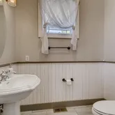 - Room Description: plank tile floor, pedestal sink, wainscoating