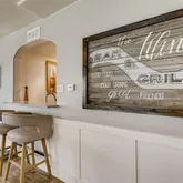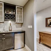- Room Description: carpet and wood style floor, rock hearth gas fireplace, custom board and batton trim, wet bar with slab granite counters, big stainless sink, wine cooler, white cabinets, tv mount, full size refrigerator, full size dishwasher, and door to 20 x 12 covered patio overlooking open space and landscaped stone fountain
