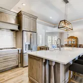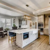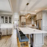 - Room Description: wood floor, Bosch 5 burner gas cooktop with exhaust hood built-in into cabinetry, stainless appliances, 2 built-in speakers, quartz counters with a marble back splash, soft close drawers and cabinets, double convection ovens, Bosch dish washer, French door refrigerator, apron double sink, glazed wood cabinets, pop up outlet, farmhouse fixtures, 10 x 4 island seating for 4, walk-in 6 x 7 pantry with built-in shelves, sitting area could be an eat in area using the storage bench as seating for banquet style seating, built-in shelves, butlers pantry, lighted crown molding