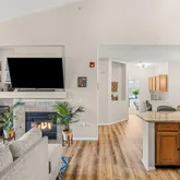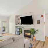Interior features include: vaulted ceilings, luxury vinyl plank flooring throughout and carpet in the bedrooms, cozy gas fireplace, matching granite countertops throughout, updated light fixtures throughout, brand-new stainless steel LG ThinkQ refrigerator with craft ice machine, Whirlpool kitchen appliances, laundry room with Samsung washer and dryer included, 2 closets in the primary bedroom including 1 walk-in, walk-in closet in the guest bedroom, additional storage in the attic, built-in desk and cabinets in the hallway, and Amazon Smart Thermostat.