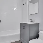 The beautifully renovated bathroom is perfectly located adjacent to the bedroom with an elegant vanity and chrome fixtures.