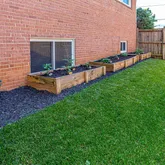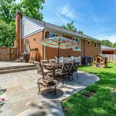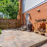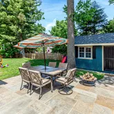 The leveled backyard features a flagstone patio (2016) with a 10'x14' shed (2022). Three large garden boxes are positioned to get sun all day long and have been planted with tomatoes and peppers.