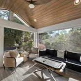 The kitchen is a place where savoir-faire meets culinary creativity. Custom cabinetry, high-end appliances, and sleek design invite conversation, cooking, and living. Custom Kolbe sliding doors lead you to a private screened-in porch that feels like an extension of the living space, while Phantom blinds provide effortless shade when needed. Step outside, and the stone patio, with its outdoor grill station and ample seating, offers the perfect spot for entertaining or unwinding.