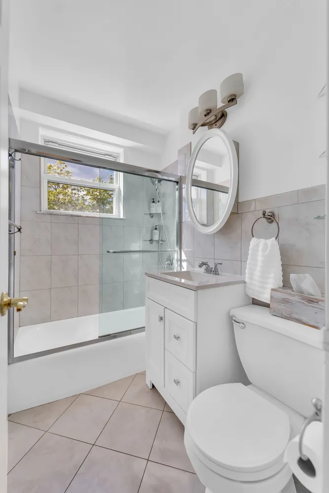 The magnificently well laid-out bedrooms easily accommodate any large bed and furnishings. Plus the rooms are situated on separate wings of the apartment. The charming bathroom has a bathtub & shower, vanity, and a window.