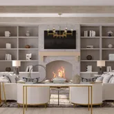 The heart of the home is a high-end custom kitchen with Thermador appliances, premium quartz Taj Mahal countertops with 10' center island, custom cabinetry, serving station to Formal Dining room and a hidden pantry. The kitchen also features a dining area with chandelier in front of the double door sliders to the yard. Dining with a view. Then the room continues to flow into a cozy den space with custom built-in shelves, TV and modern gas fireplace. Truly an entertainers dream. The formal dining room is located directly off of the kitchen and dining service station. The formal living room flows off of the den making the entertainment space even larger.