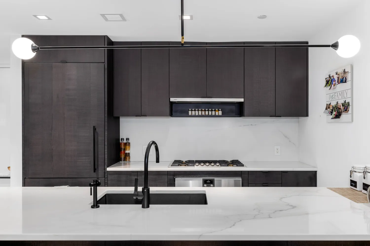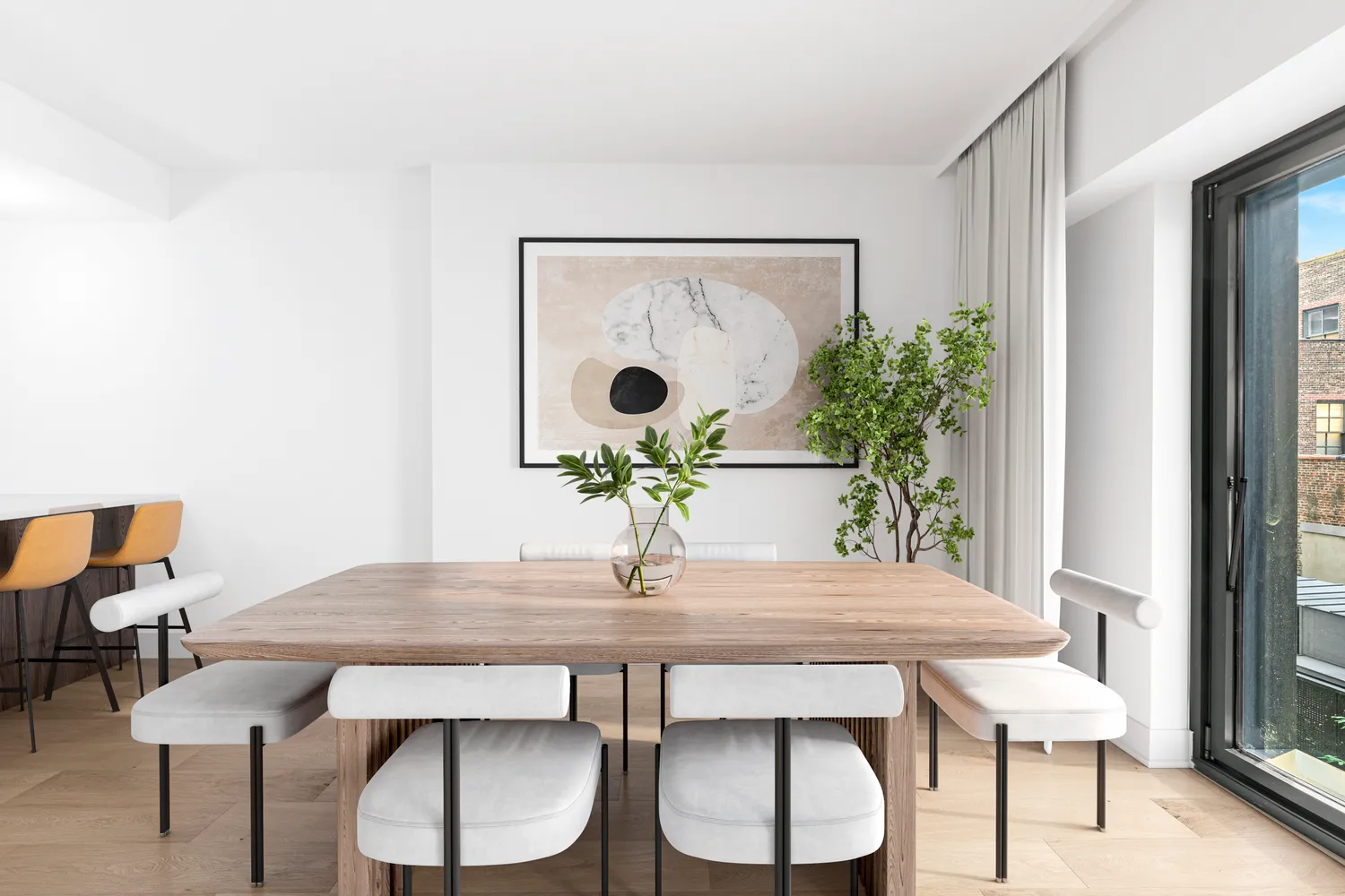 The sleek 1,417-square-foot welcomes you with bleached hardwood floors, tall ceilings and an open layout that maximizes light and views. Relax and entertain in the inviting living dining room flanked by a wall of built-in cabinetry. Oversized glass doors, Juliet balconies and an ideal position above the building's landscaped terrace provide a wonderful indoor-outdoor ambiance without the upkeep. Chefs will love the beautifully planned open kitchen where black oak cabinetry and white Bianco Oro marble countertops and backsplash surround a fleet of Gaggenau appliances, including a gas cooktop, oven, built-in microwave and dishwasher, plus a Summit wine refrigerator. The wide waterfall welcomes casual dining below designer lighting.