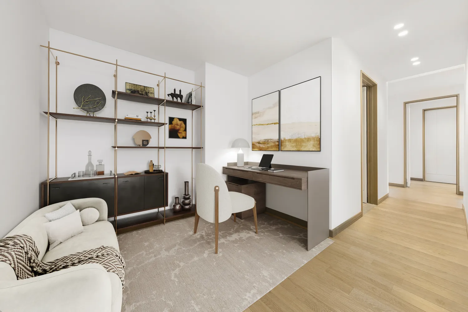 The primary bedroom suite is a haven of luxury with two large closets, including an oversized walk-in, and an expansive five-fixture en-suite bathroom. Bathroom finishes include French limestone flooring and wall tiles, a travertine slab backsplash, NuHeat radiant heated floors, a WetStyle Cube Collection deep soaking tub, smoked oak vanity millwork, an LED-illuminated medicine cabinet with mirror defogger, and Philippe Starck-designed Hansgrohe fixtures. The secondary bedroom is spacious and also features an en-suite bathroom with equally high-end finishes.
