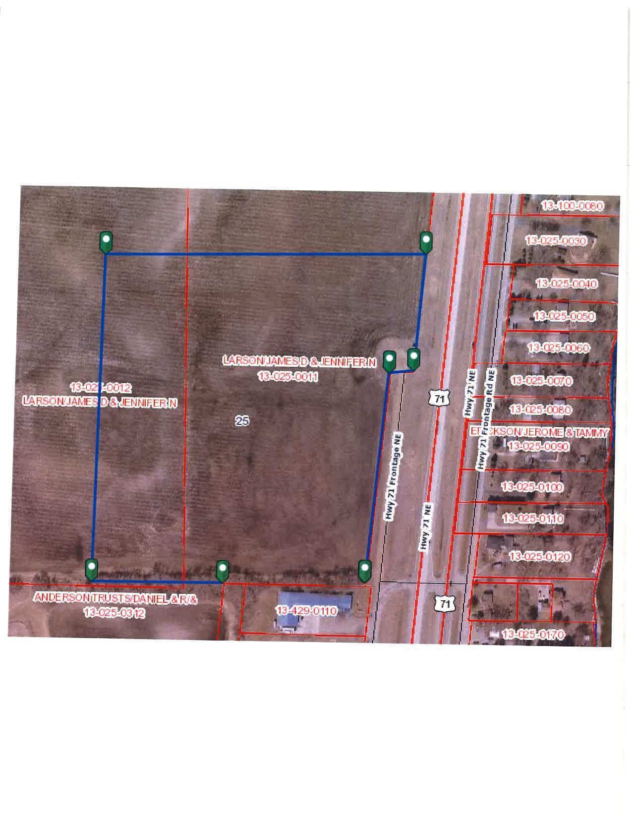 - Tax Legal Description: THAT PART OF THE SE1/4 OF SW1/4 OF SEC 24, TWP 120, RG 35, DESC AS FLWS: BEG AT SW COR OF SD SE1/4 OF SW1/4, TH N 79.39', TH E 55.60' TO W LINE OF H.B. STORAGE NORTH SIDE ADDITION, TH S TO S LINE OF SD SE1/4 OF SW1/4, TH W TO PT OF BEG; AND THAT PART OF GOVT LOT 1 OF SEC 25 LYING W'LY OF W'LY ROW LINE OF USTH #71 & STH #23 EXC THAT PART PLATTED AS H.B. STORAGE NORTH SIDE ADDITION; AND THAT PART OF GOVT LOT 2 OF SEC 25 LYING W'LY OF W'LY ROW LINE OF USTH #71 & STH #23 & LYING N'LY OF N LINE OF SU NRAY SECOND ADDITION AND ITS W'LY EXTEN- SION TO W LINE OF SD GL 2, EXC THAT PART THEREOF THAT WAS DEDICATED AS HWY 71 FRONTAGE NE ON THE VACATED PLAT OF H.B. STORAGE ADDITION.