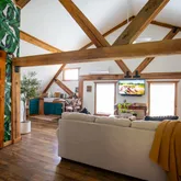 Set on 20 private acres just 50 minutes from Nashville, the home’s rustic exterior gives way to an interior where vintage character meets modern comfort. Sunlight pours through large barn windows, highlighting the open-concept design with its reclaimed wood accents, high ceilings, and thoughtfully designed living spaces. The expansive great room invites both relaxation and entertaining, while the well-appointed kitchen offers a perfect blend of style and functionality.
