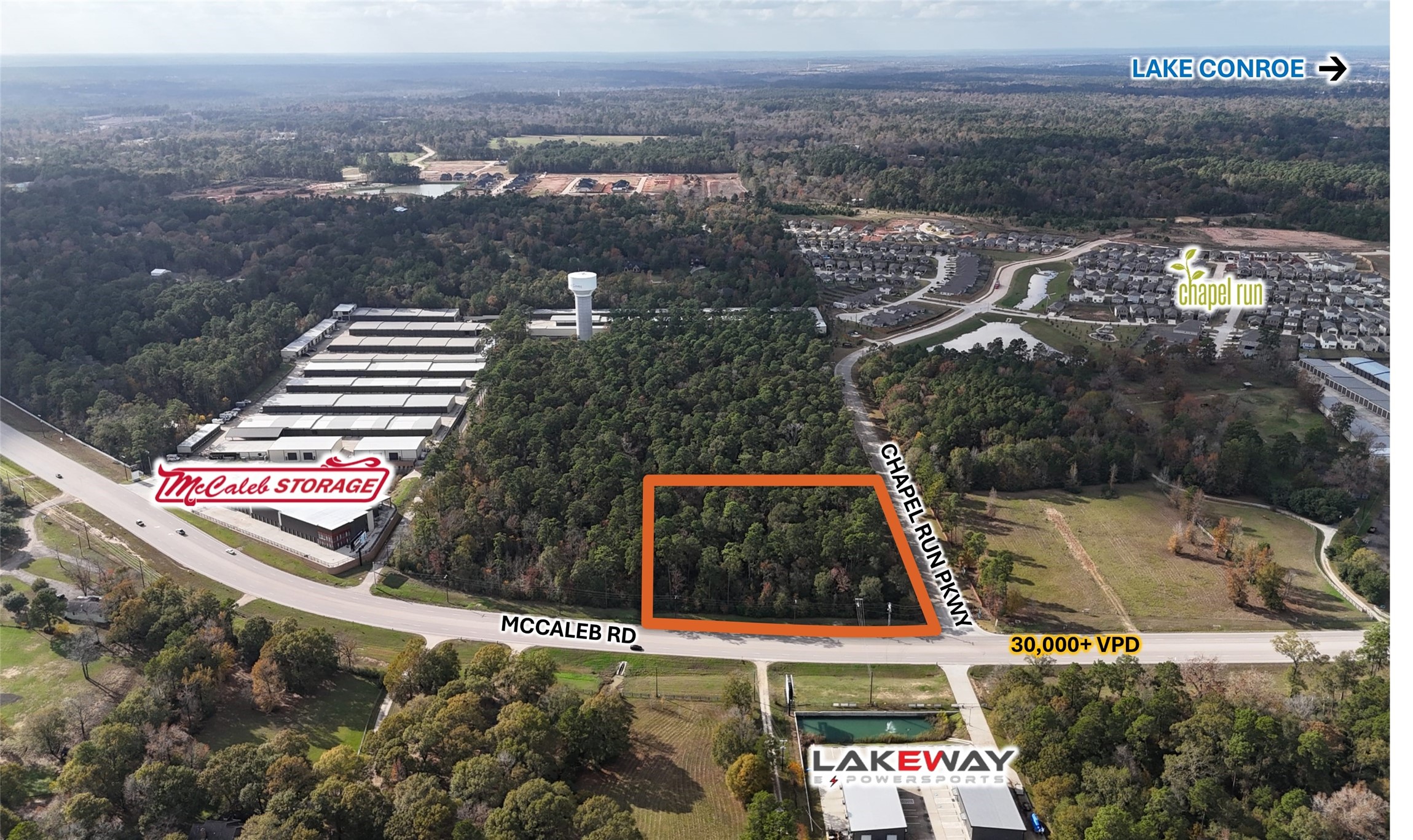 - Directions: From TX-105 W, Left on McCaleb Road, Property at the South West Corner of McCaleb Road and Chapel Run Parkway