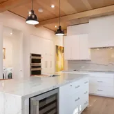 - Kitchen: Cooktop - Electric, Countertop - Quartz, Hood Over Range, Island, Oven - Electric
