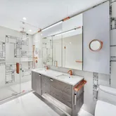 Rarely available, residence 48A is a mint-condition 2-bedroom, 2-bath corner home facing West and North, showcasing sweeping, unobstructed skyline views that span all of Manhattan and Brooklyn, including its most iconic landmarks. Floor-to-ceiling windows flood the spacious layout with light, complemented by wide-plank oak floors, 10-foot ceilings, custom window treatments, an in-unit washer/dryer, and a warm palette of light wood and satin copper. The open living, dining, and kitchen areas frame the city beyond, while the kitchen offers an eat-in island, quartz countertops, custom oak millwork, a Sub-Zero wine fridge, and integrated Miele appliances. The primary suite is a serene retreat with a custom-fitted walk-in closet and a spa-caliber bath wrapped in imported stone, complete with radiant heated floors and a rainfall shower. The split-bedroom layout enhances privacy, with the secondary bedroom enjoying its own full bath. Located above City Point, Brooklyn Point delivers an unmatched lifestyle with exceptional service, 40,000 square feet of resort-level amenities, and the best access to transportation, shopping, and dining in Downtown Brooklyn. Trader Joe’s, Target, Dekalb Market Hall, and dozens of restaurants and retailers are right downstairs. Eleven subway lines are moments away, offering a one-stop commute into Manhattan and easy access to Brooklyn Heights, Fort Greene, DUMBO, BAM, Barclays Center, and multiple parks. All of this is further enhanced by one of the last 25-year tax abatements in New York City, offering a rare and significant long-term financial benefit (expires in 2045). Amenities include:
