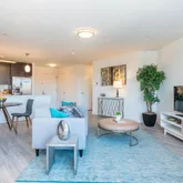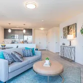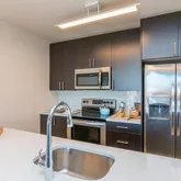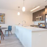 Inside your apartment, enjoy smart-home features like keyless Dormakaba entry, Deako dimmable lighting, quartz countertops, stainless steel appliances, washer/dryer in-unit, engineered hardwood flooring, & modern tile bathrooms with backlit mirrors.