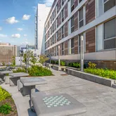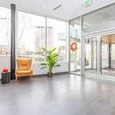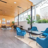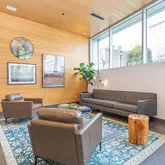 Instead of a traditional lobby, you’ll find a sun-filled co-working space featuring soaring ceilings, a media wall and interactive media table— an ideal setting for your daily hustle.