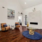 striking marble fireplace—designed to impress with a gallery-like essence. The home transitions into a relaxed open-concept kitchen,
