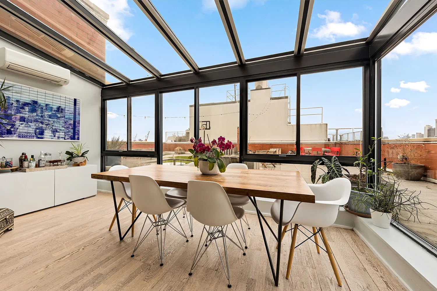 Discover your private oasis in the clouds as soon as you enter. The newly renovated kitchen is a masterclass in design and craftsmanship with extensive built in storage. The kitchen effortlessly leads into an open living space with a luminous greenhouse-style dining room. Framed by expansive windows, you’ll enjoy iconic views of the Empire State Building, Brooklyn Bridge, and Lower Manhattan—a breathtaking backdrop for every moment.