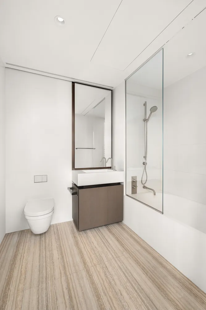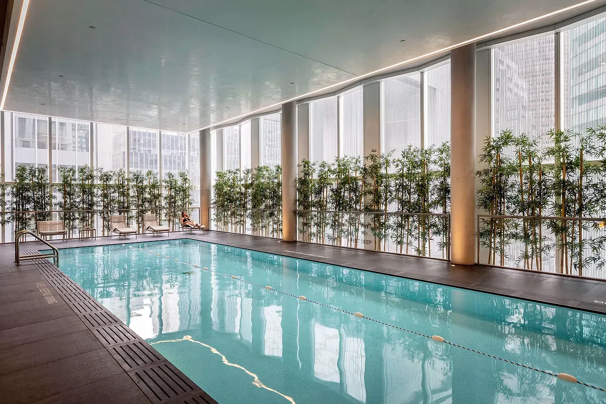 Amenity spaces span four light-filled floors, wrapped in floor-to-ceiling glass. The 60-foot garden sanctuary swimming pool is surrounded by an arbor of trees, creating a tranquil urban retreat. An enfilade of wellness spaces and lounges—including The Spa, Fitness and Yoga Salons, Billiards Lounge, Conference Room, and Library—is finished in refined materials such as slatted oak and smokey granite. The Michelin-starred Le Jardinier, helmed by Chef Alain Verzeroli and designed by AD100 recipient Joseph Dirand, is conveniently accessible via private elevator.