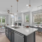 Inside, oversized windows, a central chef's kitchen, and an open-concept layout make hosting or hanging a breeze. Gather around the fireplace, statement island, designated dining nook, or retreat to any of the three outdoor spaces for fresh air. Grill on the deck, play games in your fenced-in backyard, or relax under a covered patio, enjoying the flexibility and alfresco accessibility that's increasingly hard to find this close to the city's core.