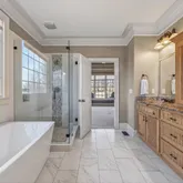 - Interior: Bookcases, Double Vanity, High Ceilings, Master On Main Level, Separate Shower, Soaking Tub, Tile Bath, Walk-In Closet(s)