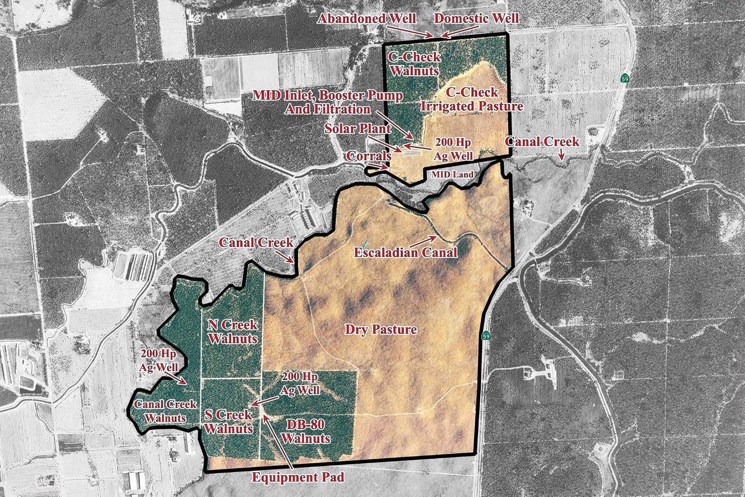 - Directions to Property: Highway 59 just North-East of Oakdale Road. Private entrance along Higwhay 59 with Gate. There's Walnuts that front along Youd Road.