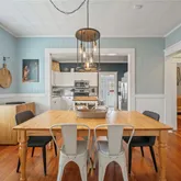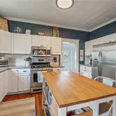 The dining area flows easily toward the bright kitchen for hosting dinners and entertaining. And that kitchen! Equipped with stainless steel appliances, ample counter space, and a woodblock topped island, gathering for meals in here will be second to none.